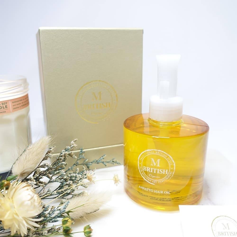 Dầu dưỡng tóc hư tổn BRITISH M Annatto Hair Oil có chứa đến 5 thành phần thiên nhiên được chứng nhận Organic bởi tổ chức Soil Association hàng đầu Anh Quốc. Tinh dầu argan với công dụng dưỡng ẩm, dầu hạt bí đỏ làm mềm tóc, dầu điều nhuộm chống oxy hóa cho tóc, dầu đậu nành giúp phục hồi hư tổn, dầu hướng dương hạn chế, ngăn ngừa chẻ ngọn. Tất cả đều được gói gọn trong 1 sản phẩm dầu dưỡng duy nhất, vừa làm đẹp tóc, vừa an toàn cho sức khỏe.